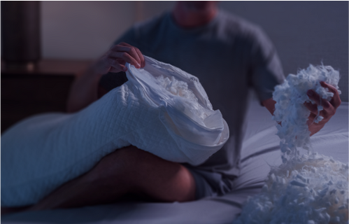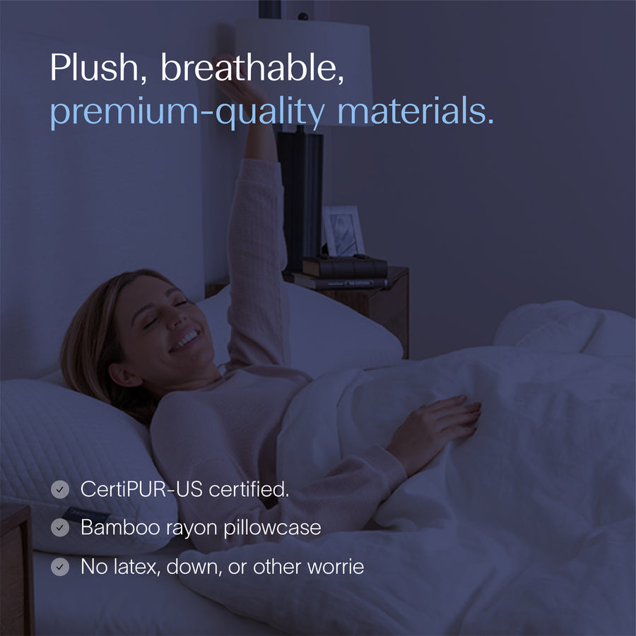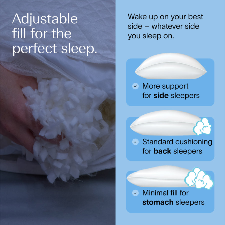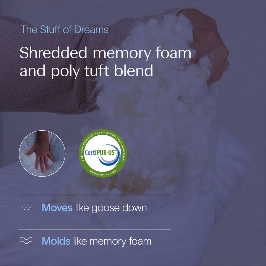 Our custom blend of shredded memory foam and fluffy poly tufts moves like down and molds like memory foam. All within the supportive structure of our crescent, gusseted pillowcase.